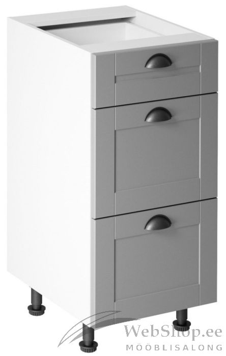 Klassikalise disainiga stiilne sahtlitega köögi põrandakapi korpus on valmistatud kvaliteetsest lamineeritud plaadist ja sahtlite esipaneelid tugevast MDF plaadist.