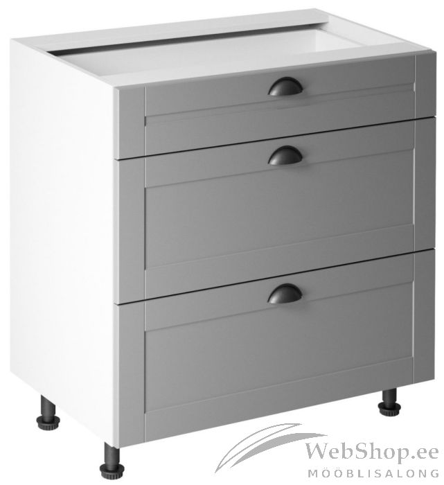 Klassikalise disainiga stiilse kolme sahtliga köögi põrandakapi korpus on valmistatud kvaliteetsest lamineeritud plaadist ja sahtlite esipaneelid tugevast MDF plaadist.