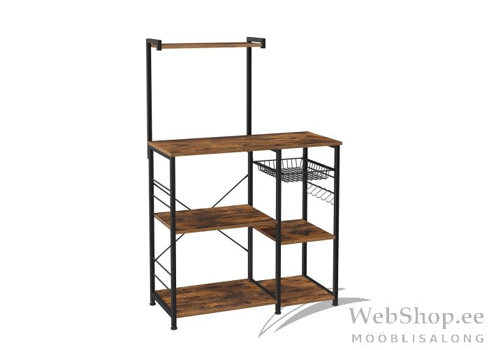 Rustikaalses stiilis praktiline köögiriiulil on musta värvi metallist raam ja detailid, mööbliplaadist riiulid. Metallist sahtli kandevõime on 5 kg. Mööbliplaadist väikeste riiulite kandevõime on 15 kg, pealmise pika riiuli kandevõime on 25 kg . Värvus: pruun/must.