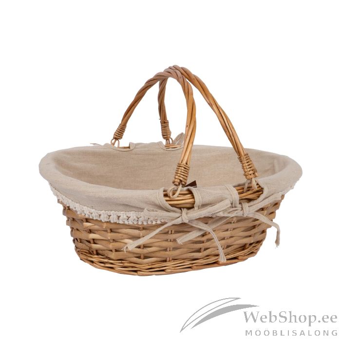 Korvi materjal: naturaalne korvipaju, lakitud. Kahe tõstetava sangaga. Tekstiilvooder: puuvillane.