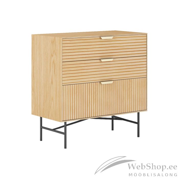 Kummut BASSEL 3-sahtliga 80x40xH80cm, 3D melamiin. Kummut on valmistatud heleda puidudekooriga melamiinplaadist. Erisuunalised, ribilised esipaneelid ja kuldsed käepidemed annavad kummutile trendika välimuse. Metallist jalad ja alusraam on viimistletud musta pulbervärviga.