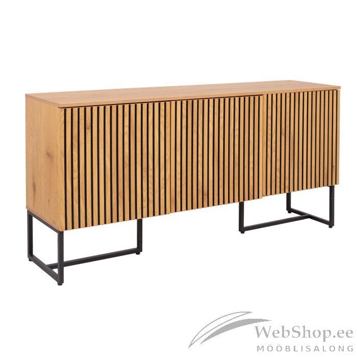 Kummut HAMPTON 3-uksega 160x40xH80cm, tammedekooriga melamiin. Kummuti pealmine plaat ja korpus on valmistatud tammedekooriga melamiinplaadist. Uksepaneele kaunistavad kitsad tammevärvi MDF liistud mustal taustal. Kummuti metallist alusraam on viimistletud musta pulbervärviga.
