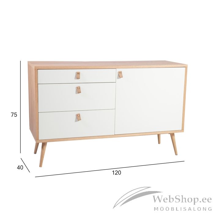 Kummut HELENA WHITE 1-ukse ja 3-sahtliga. Väliskorpus: 18mm MDF plaat naturaalse tammespooniga, lakitud. Sahtlite ja ukse esipaneelid: valgeks värvitud MDF plaat. Kunstnahast käepidemed. Tammepuidust jalad.