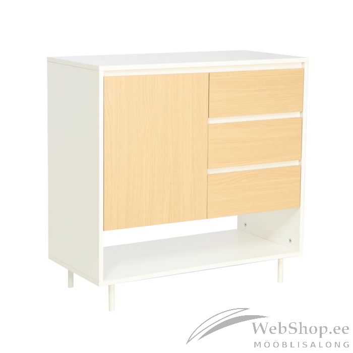 Kummut HERTA 3-sahtli ja 1-uksega 80x40xH80cm, valge/hele puit. Materjal: melamiinplaat. Värvus: hele puit/valge. Kummuti jalad on valmistatud metallist ja viimistletud valge pulbervärviga.