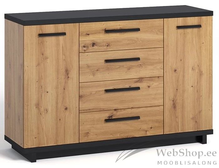 Kvaliteetsest lamineeritud plaadist valmistatud nelja sahtli ja kahe kapiosaga mahukas kummut. Kummutile annavad effekti musta värvi paksemast materjalist lagi, põhi ja sokkel.