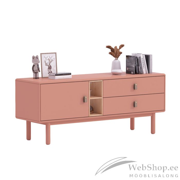 Kummut IRIS 2-sahtli ja uksega 140x40xH55cm, roosa. Kummut on valmistatud 18mm MDF plaadist. Jalad ja alusraam on valmistatud täispuidust. Kummut on viimistletud vastupidava polüuretaanvärviga. Sahtlitel on nahast käepidemed. Avatud vaheriiul on vooderdatud heleda puiduvärvi plaadiga. Kummutil on ümarad välisservad.