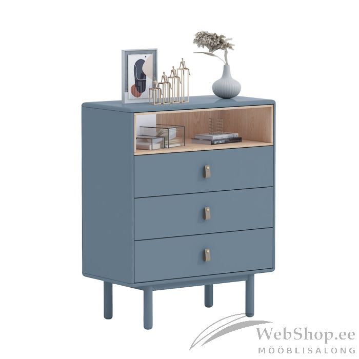 Kummut IRIS 3-sahtli ja riiuliga 80x40xH100cm, hall. Kummut on valmistatud 18mm MDF plaadist. Jalad ja alusraam on valmistatud täispuidust. Kummut on viimistletud vastupidava polüuretaanvärviga. Sahtlitel on nahast käepidemed. Avatud vaheriiul on vooderdatud heleda puiduvärvi plaadiga. Kummutil on ümarad välisservad.