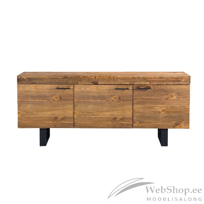 Kummut IRONBRIDGE 160x47,5xH64cm, mänd. Kummuti korpus on valmistatud männi liimpuidust. Efektse, rustikaalse välimus saavutamiseks on puidupind töödeldud liivapritsiga ning käsitsi viimistletud. Kummuti must terasest jalg on emailviimistlusega. Toote valmistamiseks on kasutatud FSC sertifikaadiga puitmaterjali.