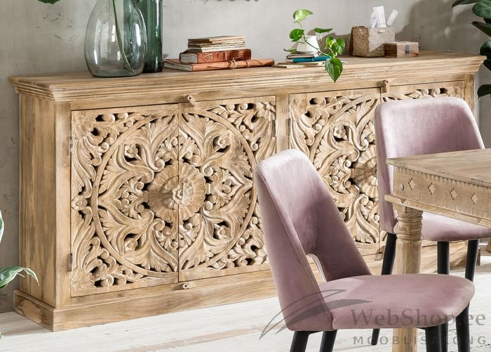 Omapäraste nikerdustega naturaalsest mangopuidust kummut. Viimistlus: valgendatud. Kummutil on 4 ust. Uste taga on üks riiul.