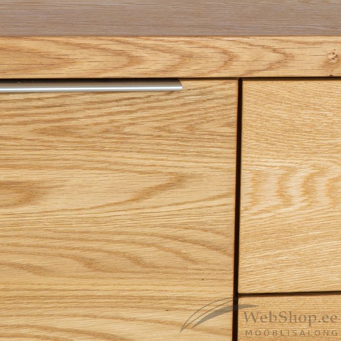 Kummuti väliskorpus, uksed ja sahtlite esipaneelid: naturaalse tammespooniga mööbliplaat, äärtes täispuidust liistud. Viimistlus: õlitatud. Metallsiinidega vaikselt sulguvad sahtlid.