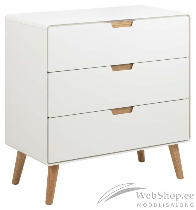 Maitsekas kummut ühendab sujuvalt funktsionaalsuse ja disaini. Mahukas 3 sahtliga kummut on piisavalt ruumikas riiete ja muu vajaliku jaoks. Valge kummut sobib peaaegu igasse ruumi oma minimalistliku disaini tõttu. Tammepuidust detailid lisavad maitsekust. Raam, sahtlid: valgeks värvitud MDF, alus: lakitud tamm. Mõõdud on 80x40xH80cm.