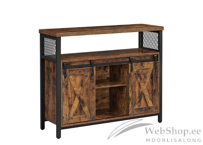 Rustikaalses stiilis mööbliplaadist kummutil on lükanduksed ning üks avatud riiul. Uste taga on reguleeritava kõrgusega vaheriiul. Reguleeritavad jalad. Metallist raam ja jalad. Värvus: pruun/must.