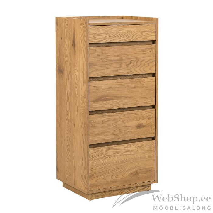 Kummut SACHA 5-sahtliga 50x40xH109cm, tammedekooriga melamiin. Kummut on valmistatud melamiinkattega mööbliplaadist. Sahtlid liiguvad metallsiinidel.