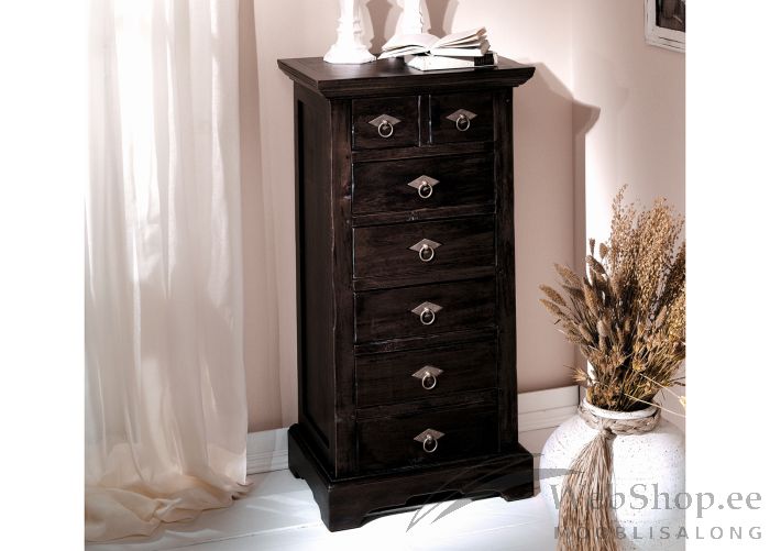 Akaatsiapuidust kummut. Viimistlus: antiik. 7 sahtlit. Sahtlid liiguvad avas siinideta. Tarnitakse monteeritult.