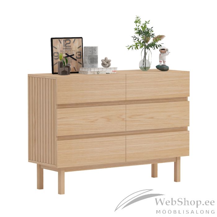 Kummut SUNNY 6-sahtliga 120x40xH85cm, melamiin tamm. Kummut on valmistatud heleda tammedekooriga melamiinplaadist. Jalad ja alusraam on valmistatud täistammepuidust.