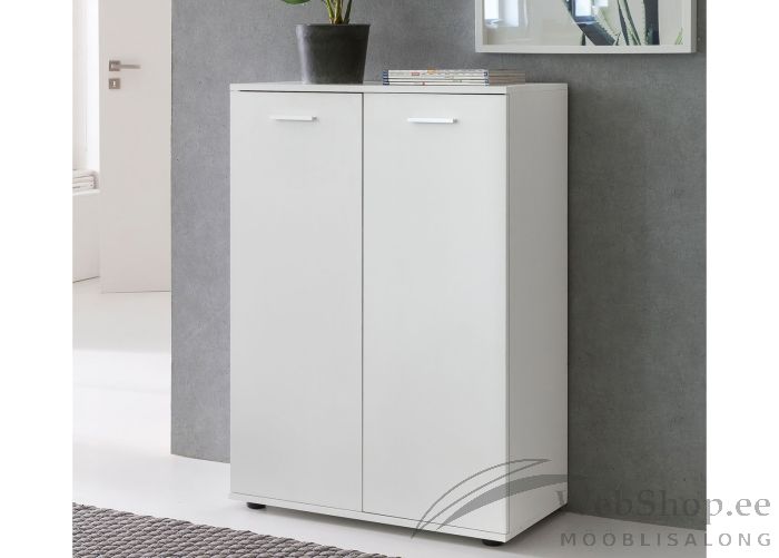 Modernses stiilis kummut. Kummut on valmistatud melamiinkattega mööbliplaadist. Viimistlus: valge. 2 ust, mille taga on 2 riiulit.