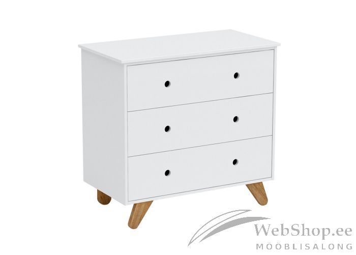 Skandinaavia stiilis kummut. Kummut sobib oma disainilt ideaalselt lastetuppa. Valmistatud valget värvi MDF-mööbliplaadist ja jalad naturaalsest männist. 3 sahtlit. Sahtlid liiguvad avas metallist siinidel ja neid on võimalik täielikult välja tõmmata.