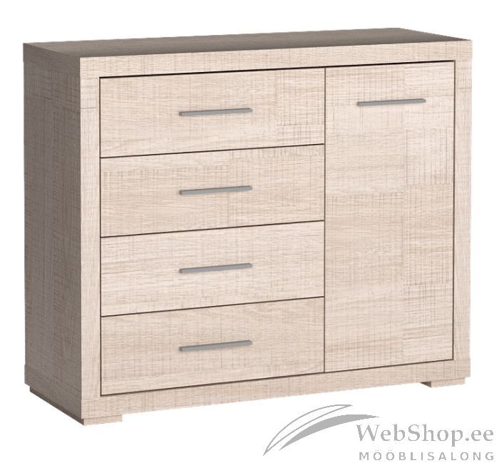 Vastupidavast melamiinkattega laminaadist valmistatud kummutil on 4 mahukat sahtlit ja ühe uksega kapiosa. Sahtlitel ja uksel on stiilsed metallist käepidemed.