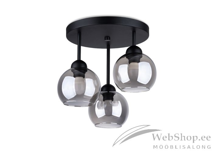 Terasest raami ja musta värvi toonitud klaaskuplitega laelamp. Sobivad elektripirnid E27 3x60W või 3x15W LED. Valgusallikad ei kuulu komplekti.