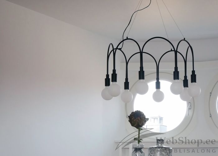 Mustast metallist valmistatud laelamp. Kaabli pikkus on 300 cm. Lambil on konkskinnitus. Lambile sobivad elektripirnid (8x) max 60W, sokliga E27. Valgusallikad ei kuulu komplekti. Rootsi disain.