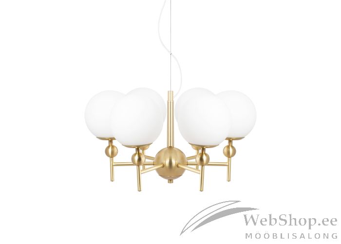 Valget värvi klaasist kuplitega laelamp. Messingu tooni metallist detailid. Kaabel on tekstiilist, 120cm. Lambile sobivad elektripirnid 6x max 40W, sokliga E14. Valgusallikad ei kuulu komplekti. Skandinaavia disain.