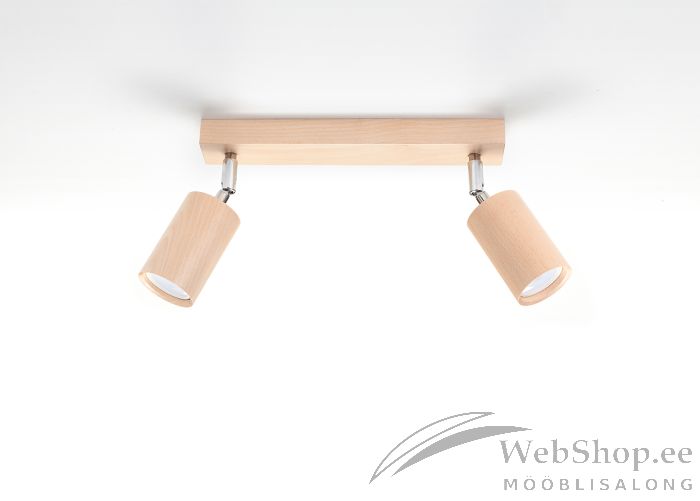 Stiilne puidust laelamp. Viimistlus: naturaalne. Lambile sobivad elektripirnid 2x max 40W, sokliga GU10. Valgusallikad ei kuulu komplekti. Kuplite suund on reguleeritav.