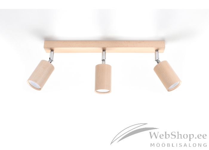 Stiilne puidust laelamp. Viimistlus: naturaalne. Lambile sobivad elektripirnid 3x max 40W, sokliga GU10. Valgusallikad ei kuulu komplekti. Kuplite suund on reguleeritav.