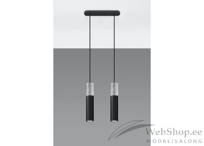 Stiilne metallist ja betoonist kuplitega laelamp. Viimistlus: must/hall. Lambile sobivad elektripirnid 2x max 40W, sokliga GU10. Valgusallikad ei kuulu komplekti.