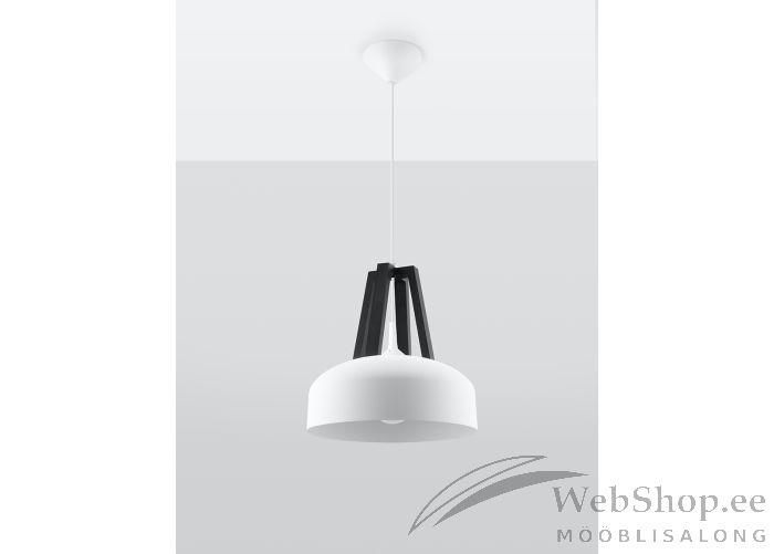 Stiilne puidust ja metallist laelamp. Viimistlus: valge/must. Lambile sobib elektripirn max 60W, sokliga E27. Valgusallikas ei kuulu komplekti.