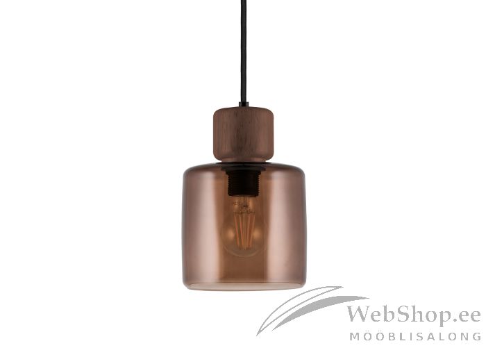 Pruuni värvi klaasist kupliga laelamp. Puidust detail. Lambile sobib elektripirn max 60W, sokliga E27. Valgusallikas ei kuulu komplekti. Lambil on must tekstiilist kaabel. Valgustugevuse reguleerimise võimalus seinalülitist. Skandinaavia disain.