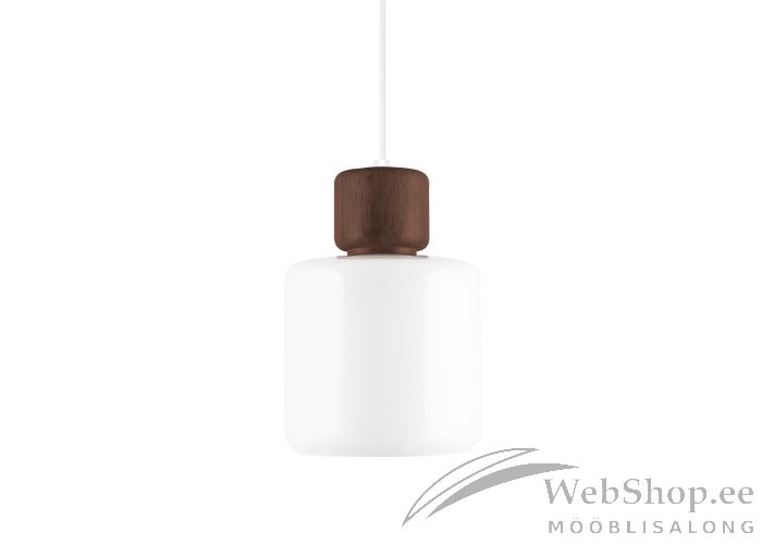 Valge klaasist kupliga laelamp. Puidust detail. Lambile sobib elektripirn max 60W, sokliga E27. Valgusallikas ei kuulu komplekti. Lambil on valge tekstiilist kaabel. Valgustugevuse reguleerimise võimalus seinalülitist. Skandinaavia disain.