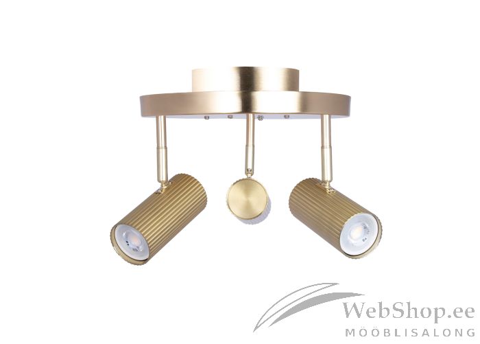 Modernne toru kujuliste kuplitega laelamp. Lamp on valmistatud harjatud messingu tooni metallist. Lambi kuplid on erinevat pidi kallutatavad ja suunatavad. Lambile sobivad elektripirnid 3x max 28W, sokliga GU10. Valgusallikad ei kuulu komplekti. Konkskinnitus. Valgustugevuse reguleerimise võimalus seinalülitist. Skandinaavia disain.