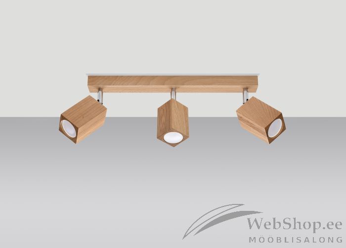 Stiilne puidust laelamp. Viimistlus: tamm. Lambile sobivad elektripirnid 3x max 40W, sokliga GU10. Valgusallikad ei kuulu komplekti. Kuplite suund on reguleeritav.