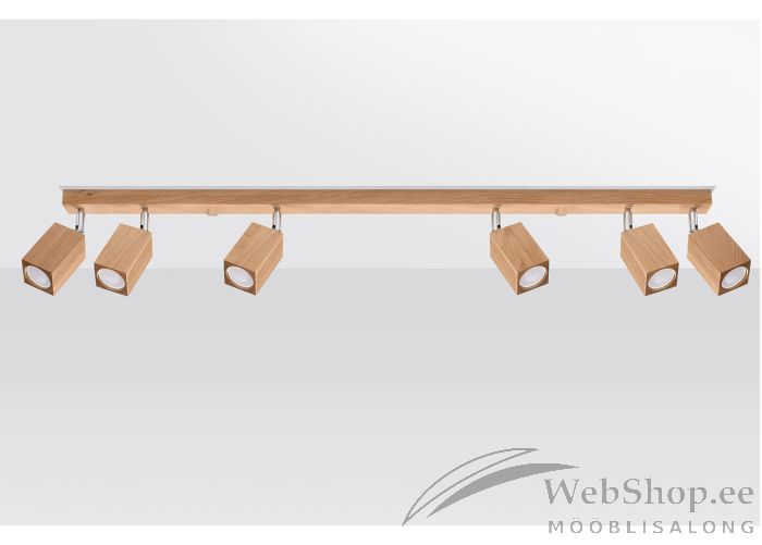 Stiilne puidust laelamp. Viimistlus: tamm. Lambile sobivad elektripirnid 6x max 40W, sokliga GU10. Valgusallikad ei kuulu komplekti. Kuplite suund on reguleeritav.
