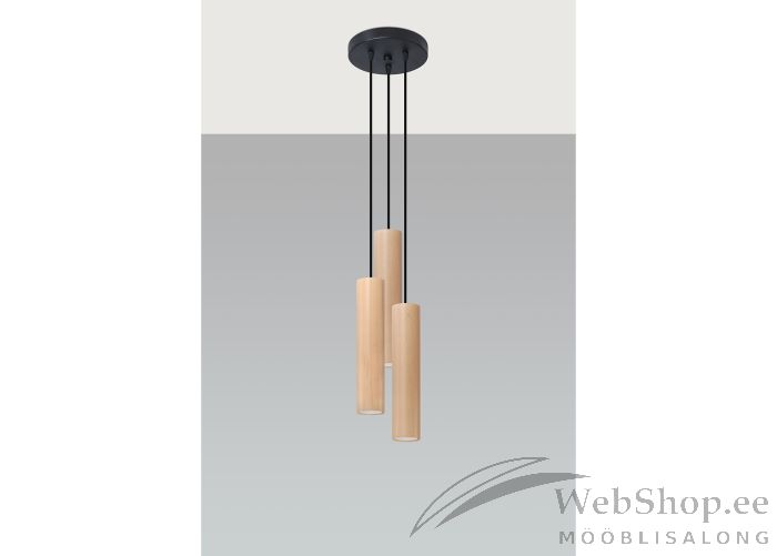 Stiilne puidust laelamp. Viimistlus: naturaalne. Lambile sobivad elektripirnid 3x max 40W, sokliga GU10. Valgusallikad ei kuulu komplekti.