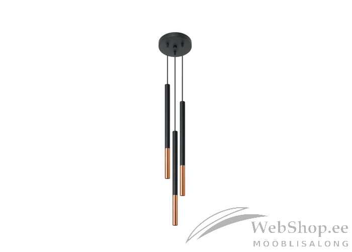 Elegantse välimusega minimalistlik laelamp. Matt must ja läikiv vask teras toetavad nii klassikalist, kui ka kaasaegset sisekujunduses. Valgusallikas 3x40W võimsusega ning G9 sokliga. Pinge 220V, kaitseaste IP20. Valgusallikad ei kuulu komplekti.