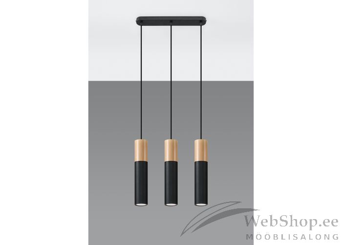 Stiilne puidust ja metallist laelamp. Viimistlus: must/naturaalne. Lambile sobivad elektripirnid 3x max 40W, sokliga GU10. Valgusallikad ei kuulu komplekti.