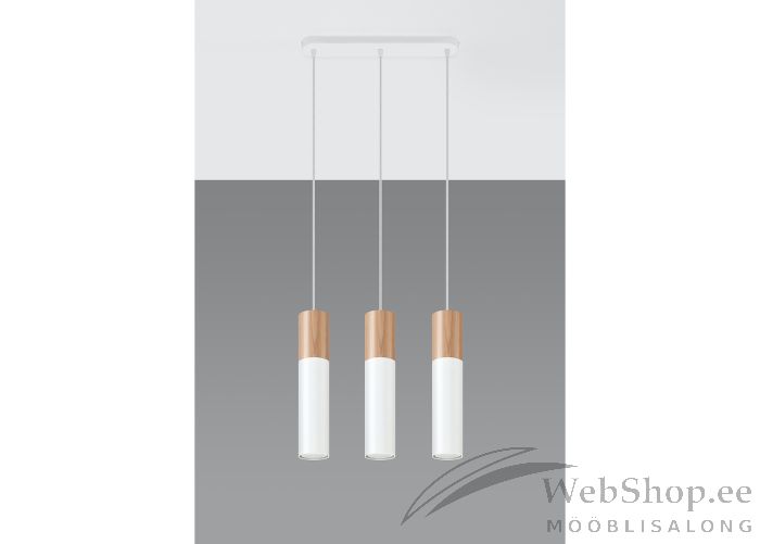 Stiilne puidust ja metallist laelamp. Viimistlus: valge/naturaalne. Lambile sobivad elektripirnid 3x max 40W, sokliga GU10. Valgusallikad ei kuulu komplekti.