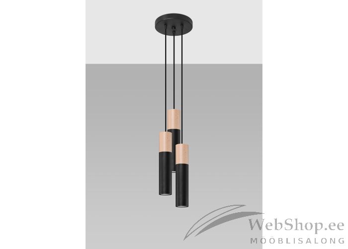 Stiilne puidust ja metallist laelamp. Viimistlus: must/naturaalne. Lambile sobivad elektripirnid 3x max 40W, sokliga GU10. Valgusallikad ei kuulu komplekti.