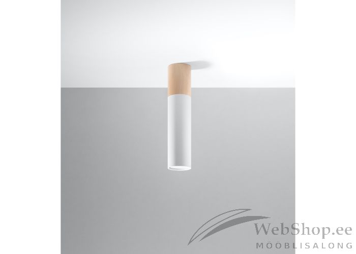 Stiilne puidust ja metallist laelamp. Viimistlus: valge/naturaalne. Lambile sobib elektripirn max 40W, sokliga GU10. Valgusallikas ei kuulu komplekti.