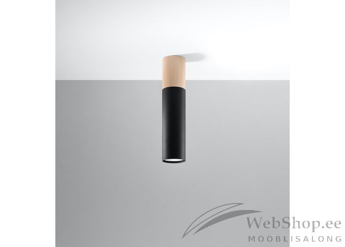 Stiilne puidust ja metallist laelamp. Viimistlus: must/naturaalne. Lambile sobib elektripirn max 40W, sokliga GU10. Valgusallikas ei kuulu komplekti.