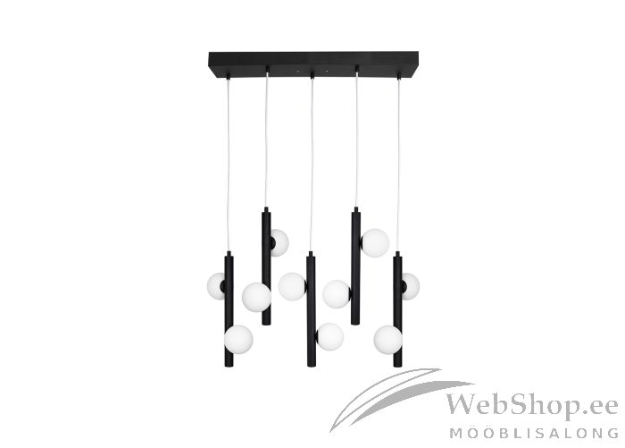 Matt mustast metallist ja matt valgete klaasist kuplitega laelamp. Valgusallikad ripuvad kahes reas alla, mis loovad omapärase atmosfääri. Kaablite pikkus on reguleeritav, ehk lampe on võimalik riputada erinevatele tasanditele. Lambile sobivad elektripirnid 10x max 28W, sokliga G9. Valgusallikad ei kuulu komplekti. Konkskinnitus. Valgusvoo reguleerimise võimalus seinalülitist. Skandinaavia disain.