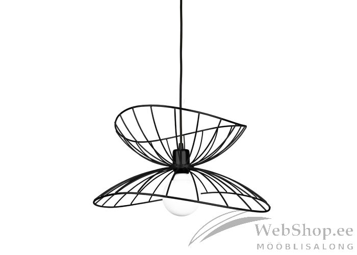 Mustast metallist valmistatud laelamp. Lambil on mustast tekstiilist kaabel, pikkusega 120 cm. Konkskinnitus. Sobib elektripirn max 60W, sokliga E27. Valgusallikas ei kuulu komplekti. Lampi on võimalik kasutada ka nii, et mõlemad kuplid on suunatud alla. Rootsi disain.