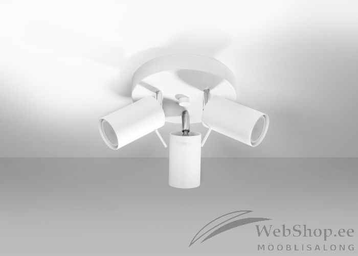 Stiilne metallist laelamp. Viimistlus: valge. Lambile sobivad elektripirnid 3x max 40W, sokliga GU10. Valgusallikad ei kuulu komplekti. Kuplite suund on reguleeritav.