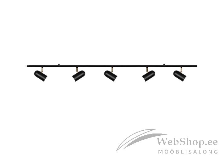 Modernses stiilis lae-/-seinalamp. Valmistatud musta värvi metallist. Kuplite suund on reguleeritav. Sobivad elektripirnid 5x max 28W, sokliga GU10. Valgusallikad ei kuulu komplekti. Skandinaavia disain. Lambil on 350cm pikkune tekstiilist kaabel lülitiga.