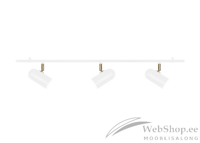 Modernses stiilis lae-/-seinalamp. Valmistatud valget värvi metallist. Kuplite suund on reguleeritav. Sobivad elektripirnid 3x max 28W, sokliga GU10. Valgusallikad ei kuulu komplekti. Skandinaavia disain. Lambil on 200cm pikkune tekstiilist kaabel lülitiga.