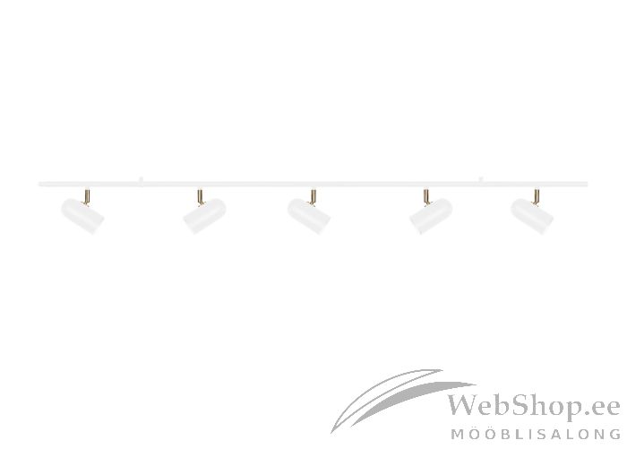 Modernses stiilis lae-/-seinalamp. Valmistatud valget värvi metallist. Kuplite suund on reguleeritav. Sobivad elektripirnid 5x max 28W, sokliga GU10. Valgusallikad ei kuulu komplekti. Skandinaavia disain. Lambil on 200cm pikkune tekstiilist kaabel lülitiga.