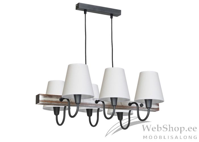 Lambil on 6 valget tekstiilist kuplit. Grafiidi värvi metallist ja puidust raam. Sobivad elektripirnid (6x) max 40W, sokliga E14. Valgusallikad ei kuulu komplekti.