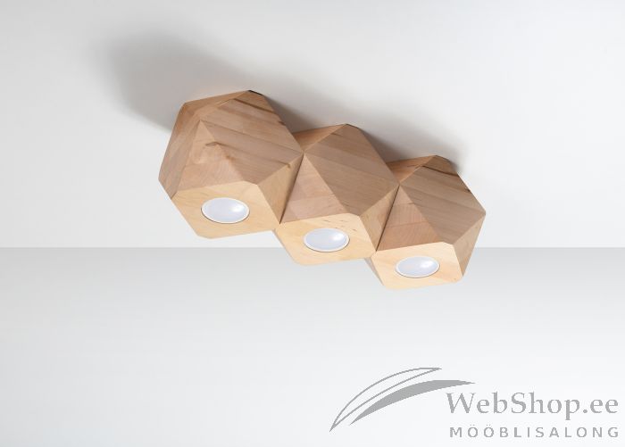 Stiilne puidust laelamp. Lambile sobib elektripirnid 3x max 40W, sokliga GU10. Valgusallikad ei kuulu komplekti.
