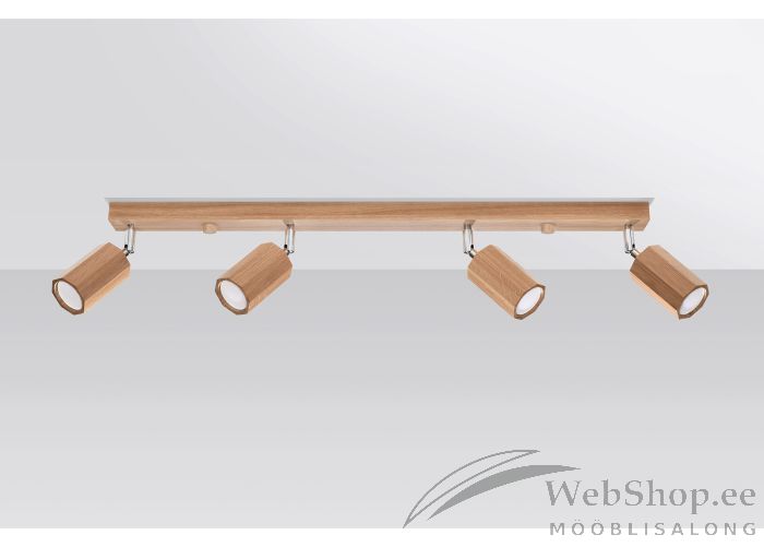 Stiilne puidust laelamp. Viimistlus: tamm. Lambile sobivad elektripirnid 4x max 40W, sokliga GU10. Valgusallikad ei kuulu komplekti. Kuplite suund on reguleeritav.